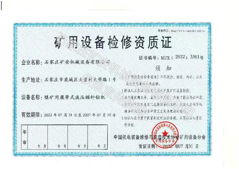 石家莊礦安機械設備有限公司成立于2011年3月,公司位于風景優(yōu)美、科技發(fā)達、交通便利的石家莊市欒城區(qū),是一家專注生產(chǎn)煤礦井下支護機具(錨桿鉆機)和安全鉆機(防突,架柱等)及氣動隔膜泵等礦用機械設備的********,是國內(nèi)煤礦機械裝備的生產(chǎn)商和服務商,根據(jù)用戶需求提供井下適用的鉆機施工解決方案。公司致力于打造研發(fā)、制造、銷售、服務為一體的現(xiàn)代化企業(yè),全心全意為煤礦生產(chǎn)保駕護航。 ? 公司建有裝配車間、機加車間和調(diào)試車間,擁有嚴格的質量控制體系、先進的產(chǎn)品開發(fā)系統(tǒng)、完善的試驗檢測設施、良好的售后服務保障。先后與中煤科工集團沈陽研究院、西安研究院、太原理工大學、燕山大學等知名院校建立了緊密的合作關系。 ? 公司產(chǎn)品主要銷往山西、陜西、山東、內(nèi)蒙古、黑龍江、云南、貴州等七十多個礦區(qū)和地方煤礦,擁有一支成熟的售后技術團隊,并且和中煤集團、華電煤業(yè)集團、華潤煤業(yè)集團、潞安集團、山西焦煤、淮北礦業(yè)等國內(nèi)知名企業(yè)達成長期合作關系。 ? 公司始終秉持“讓煤礦生產(chǎn)更安全”的發(fā)展使命,力求誠信與創(chuàng)新,追求卓越與完美,深知“實實在在、心無旁騖做實業(yè)”,這才是本分!石家莊礦安機械設備有限公司愿與您攜手共進,共同發(fā)展!為客戶創(chuàng)造價值,提供優(yōu)質的產(chǎn)品和*佳的服務是我們永無止境的理念!